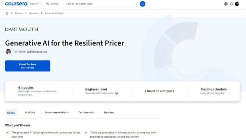 This Dartmouth College and KPMG collaboration tackles AI-powered pricing head-on. The course teaches how to leverage generative AI for dynamic pricing strategies that adapt to market changes. You learn to build pricing models that respond to economic shifts in real-time.
